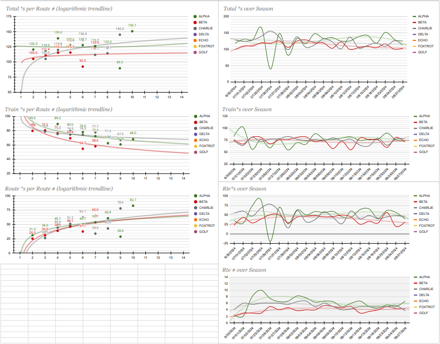 The G-Dashboard visualized player performance across all 50 games, highlighting how point totals, train scores, and route completions scaled with the number of tickets held. Logarithmic trendlines revealed nonlinear relationships, such as diminishing returns after a specific route count. Time-series charts captured changes over the season, making it easy to spot scoring streaks, shifts in strategy, and overall consistency.